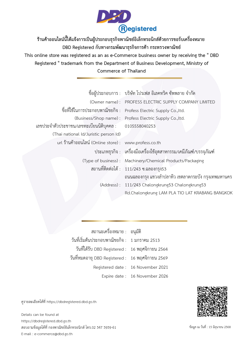 ทางบริษัทได้ขึ้นทะเบียนเป็นผู้ประกอบธุรกิจพาณิชย์อิเล็กทรอนิกส์ด้วยการขอรับเครื่องหมาย DBD Registered กับทางกรมพัฒนาธุรกิจการค้า กระทรวงพาณิชย์ ไว้เรียบร้อย เพื่อความมั่นใจในการติดต่อซื้อขายสินค้า ลูกค้าสามารถสั่งซื้อสินค้าได้อย่างสบายใจ